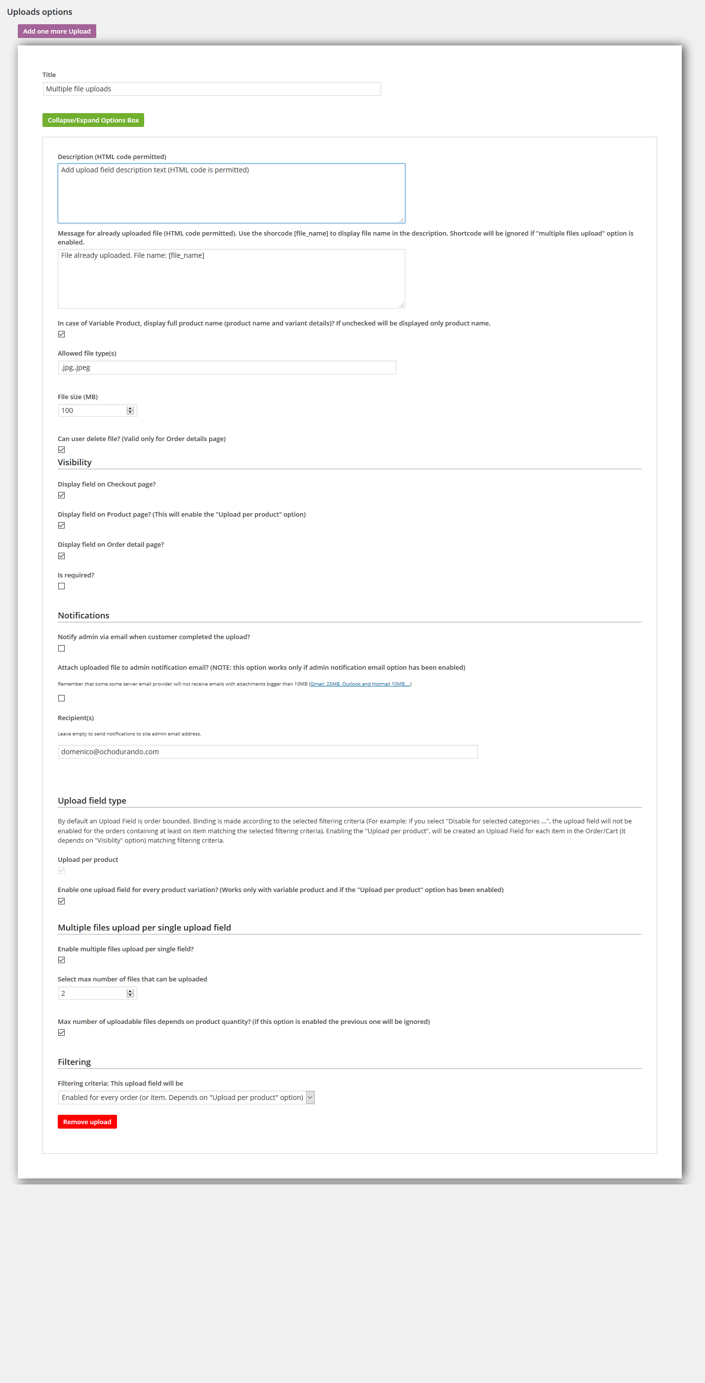 Furthermore under the "options" menu voice can be configured some other common options to the upload fileds (like progress bar color or pload fileds box position on product page)