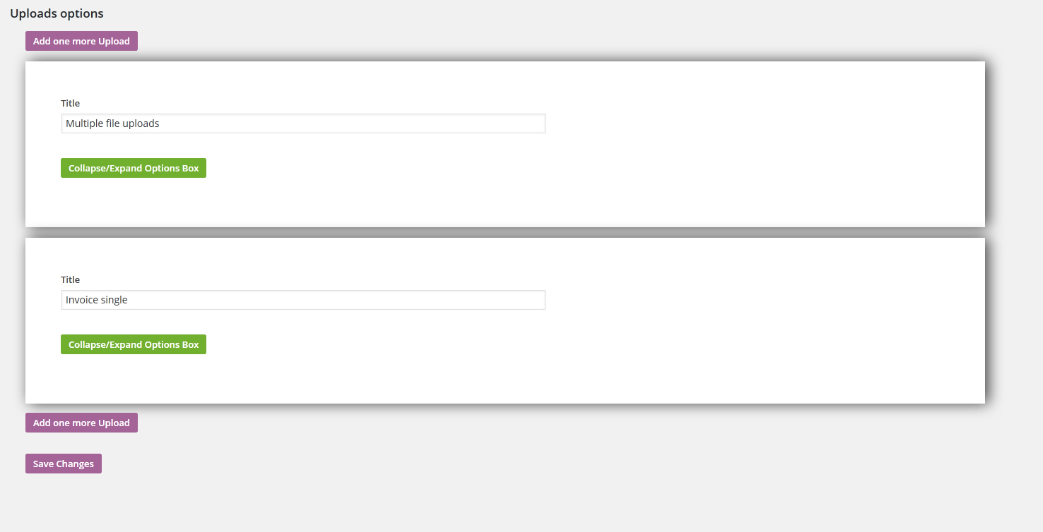 For every upload you can define some additional options like Upload title, description (HTML code is accepted), file types allowed, file size and option to allow user to delete file.